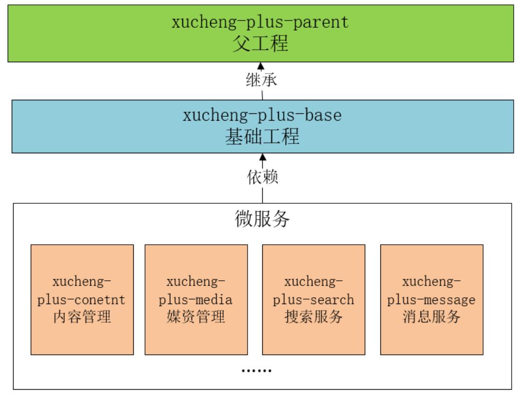 xuecheng-plus-content-api接口工程的父工程是xuecheng-plus-content,它依赖了xuecheng-plus-base基础工程。